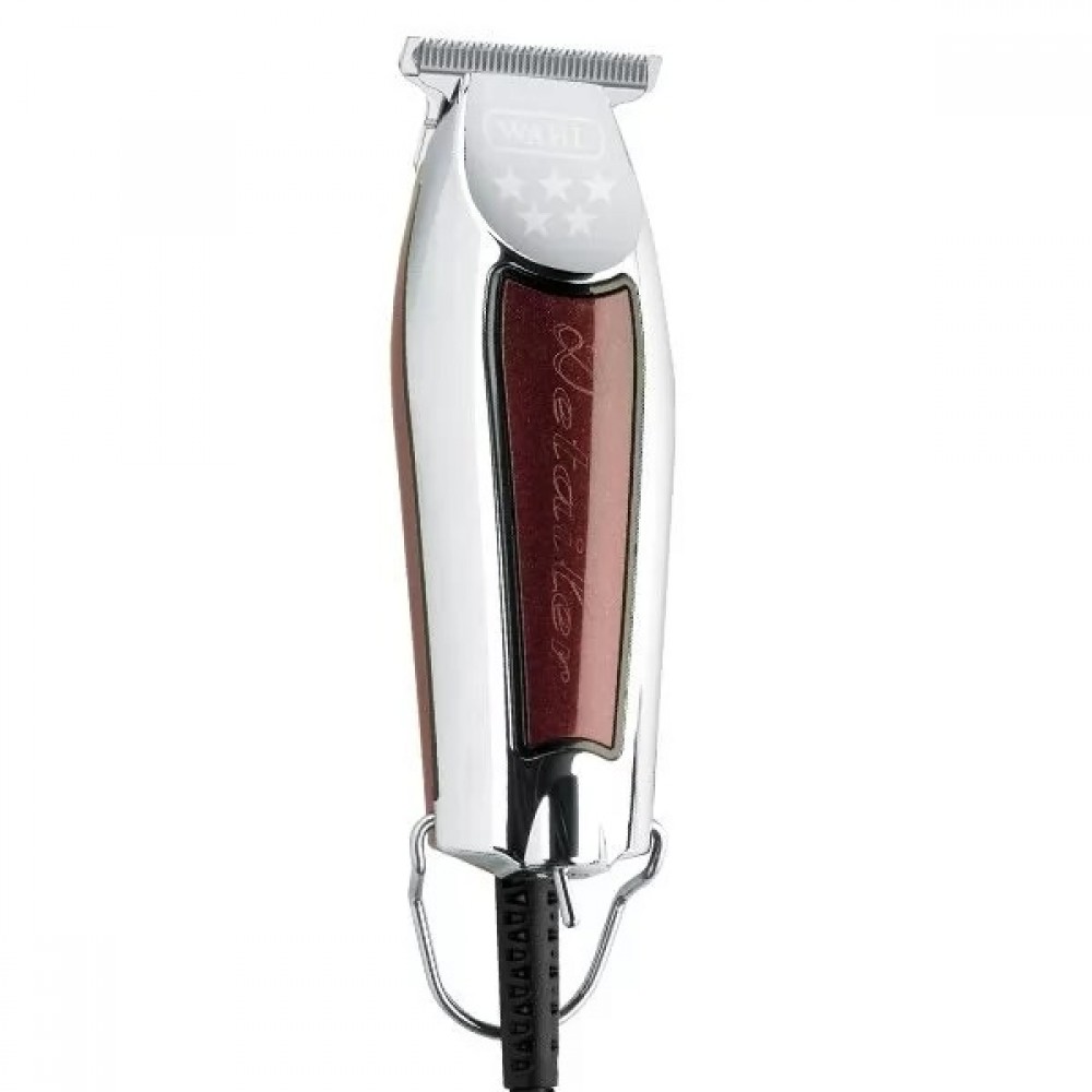 Стоит отметить традиционное оформление машинки WAHL EXTRA WIDE Detailer в духе серии 5 STAR. Прочный корпус в бордовом цвете с металлическими вставками и логотипом серии. Оригинальный выключатель в виде тумблера и металлическая петля для подвешивания делают модель оригинальной.