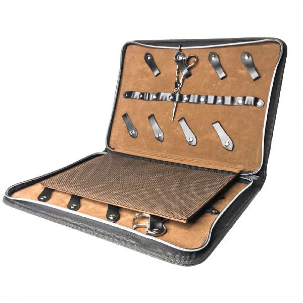 Чехол Sway Black Edition – имеет оптимальные размеры для хранения максимально большого количества ножниц и прочих аксессуаров. Кейс надежно закрывается на молнию, благодаря чему вам точно не придется переживать о сохранности инструмента. Чехол изготовлен из прочной основы, которая покрыта серой с блестками тканью, также аксессуар имеет легкий вес и привлекательный дизайн. Дисплей вмешает в себе ножницы любого типа, размером до 9-ти дюймов. Благодаря такому аксессуару все инструменты будут всегда под рукой и в полном порядке.