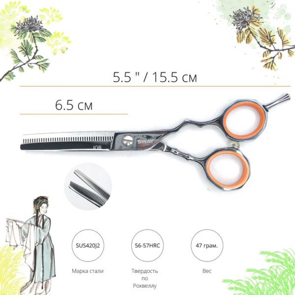 Ножницы серии JOB от торговой марки Sway – традиционные ощущения при стрижке благодаря классическому дизайну. Регулируемая винтовая группа и полировка до зеркального блеска обеспечат мягкий и плавный ход. Данная серия ножниц идеально подойдет для начинающих мастеров. Модель 110 56455 придаст традиционные ощущения при стрижке благодаря классическому расположению колец, а упоры под пальцы снимут нагрузку с кистевых суставов. Благодаря регулируемой винтовой группе ножницы имеют мягкий, плавный ход, а полуконвекционные кромки позволят сохранить заточку значительно дольше, в сравнении с аналогами других фирм. 40 зубцов призматической формы предотвратят соскальзывание волос при стрижке и обеспечат точный срез.