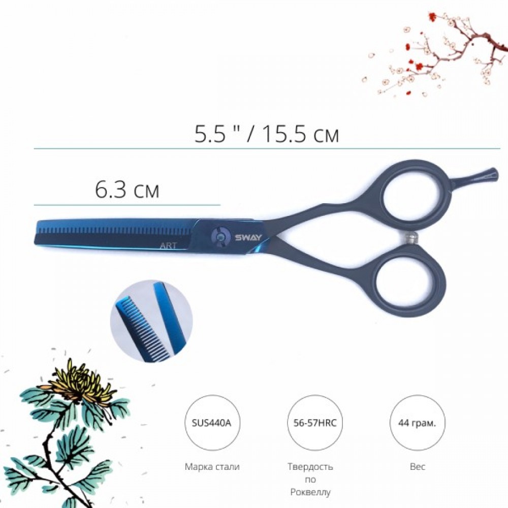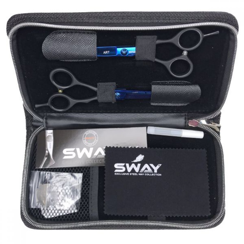 Набор профессиональных ножниц представлен в серии Sway Art Limited Edition. Данный набор создан для креативных и талантливых мастеров, которые готовы бросить вызов классическому стилю. Полотна ножниц имеют глянцевое высокотехнологичное антиаллергенное покрытие из тефлона и титана, благодаря которому обретают собственный неповторимый стиль. А идентичные рукоятки на ножницах дают возможность ощущать постоянный комфорт в работе не меняя положение кисти.