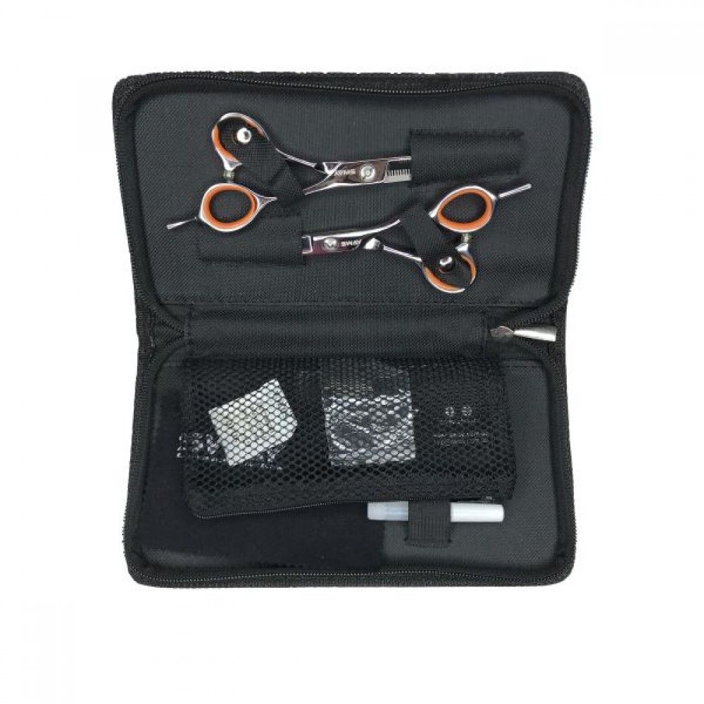 Данный сет это отличный выбор для новичка-парикмахера. Набор соответствует всем базовым требованиям по качеству стали и заточки. Приятный дополнением к набору станет фирменный текстильный чехол от торговой марки Sway. Стильный, черный чехол станет отличным местом для хранения ножниц, а так же способен вместить набор мелких аксессуаров благодаря сетчатому кармашку внутри.