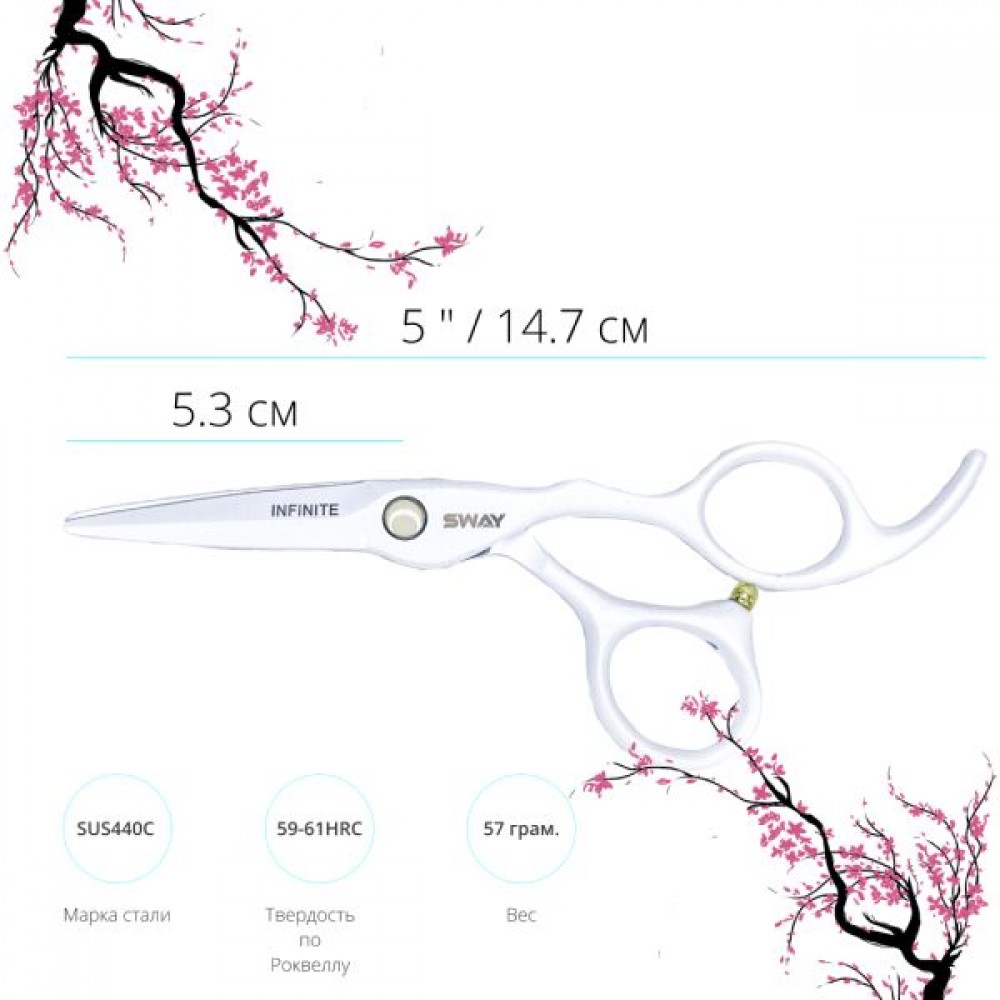Во всех ножницах серии "SWAY INFINITE" используется нержавеющая сталь марки SUS 440C (С-кобальт). Примечательна она тем что, по своей структуре сталь марки SUS440 имеет высокую твердость, а также устойчивость к коррозии; добавления кобальта (SUS440С) придает великолепные режущие свойства и повышает стойкость режущих кромок к износу.